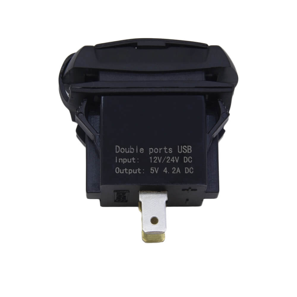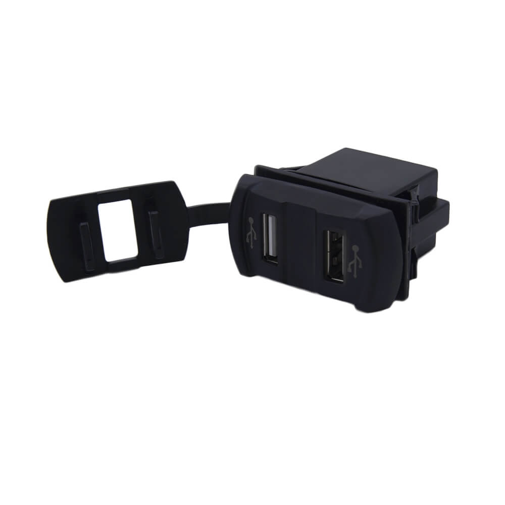 Встраиваемый в панель преобразователь на два порта USB. Устройство подключается к бортовой сети автомобиля 12 В или 24 В. Ток каждого порта составляет 2,1А. Преобразователь устанавливается в прямоугольное монтажное отверстие и фиксируется специальными защелками. На заднюю стенку устройства выведены две плоские клеммы для подключения входного напряжения.